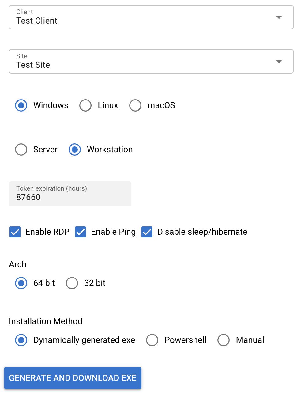 1. Login to Tactical RMM and Download Agent as .exe and .ps1 with a long expiry time (eg. 1 year), You will need to create a MSI for each Client/Site or use a "staging" Client and move the devices after enrolment.